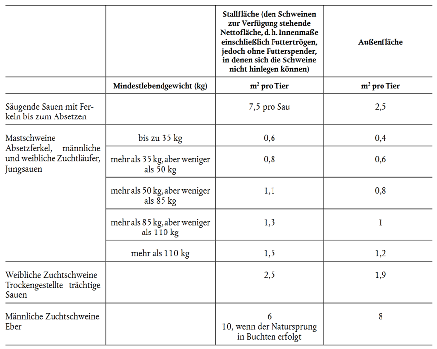Für Schweine sind die Besatzdichte, die Mindeststallflächen und die Mindestaußenflächen in Anhang I Teil III festgelegt.Art. 11 Merkmale und technische Anforderungen in Bezug auf die Mindeststallflächen und die Mindestaußenflächen: Sowohl die Mindeststallflächen als auch die Mindestaußenflächen gemäß Anhang I Teil III müssen mindestens zur Hälfte in fester Bauweise ausgeführt sein, d. h. es darf sich nicht um Spaltenböden oder Gitterroste handeln.Art. 12 Anforderungen in Bezug auf den Bewuchs und die Merkmale von Freigelände: